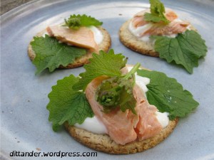 As with other mustards, the flavour does not survive cooking so I decided to eat it raw with some smoked trout & yoghurt on oatcakes. The yoghurt balances the bitterness of the leaves and their spiciness combines well with the strong flavoured trout.