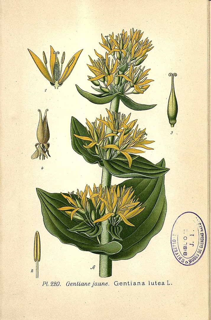 Gentiana lutea L. Masclef Atlas des plantes de France Vol. 3 Published December 7, 2015 at 714 × 1080 in The Medicinal Roots of Cocktail Bitters ← Previous Next → Gentian root was one of themost popular bittering agents. plantillustrations.org